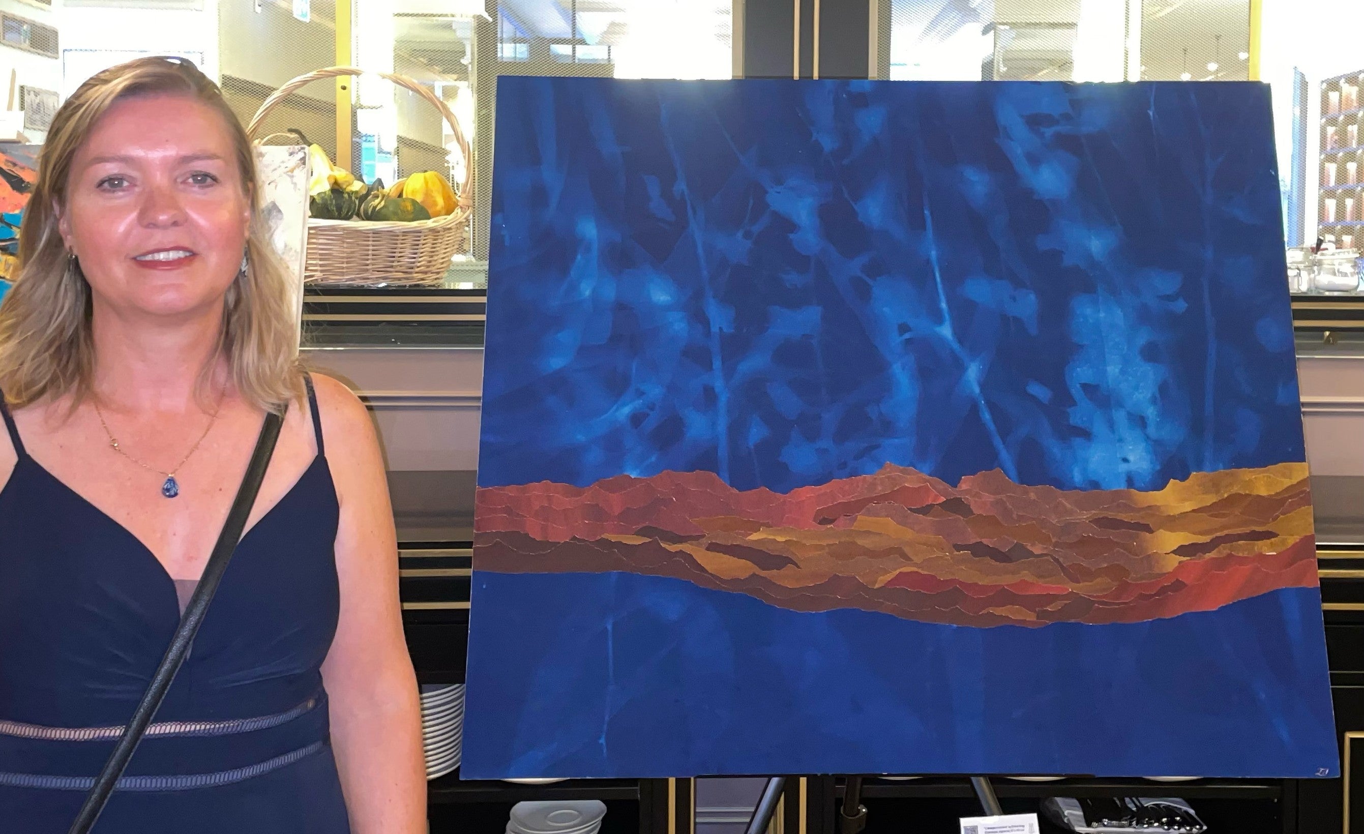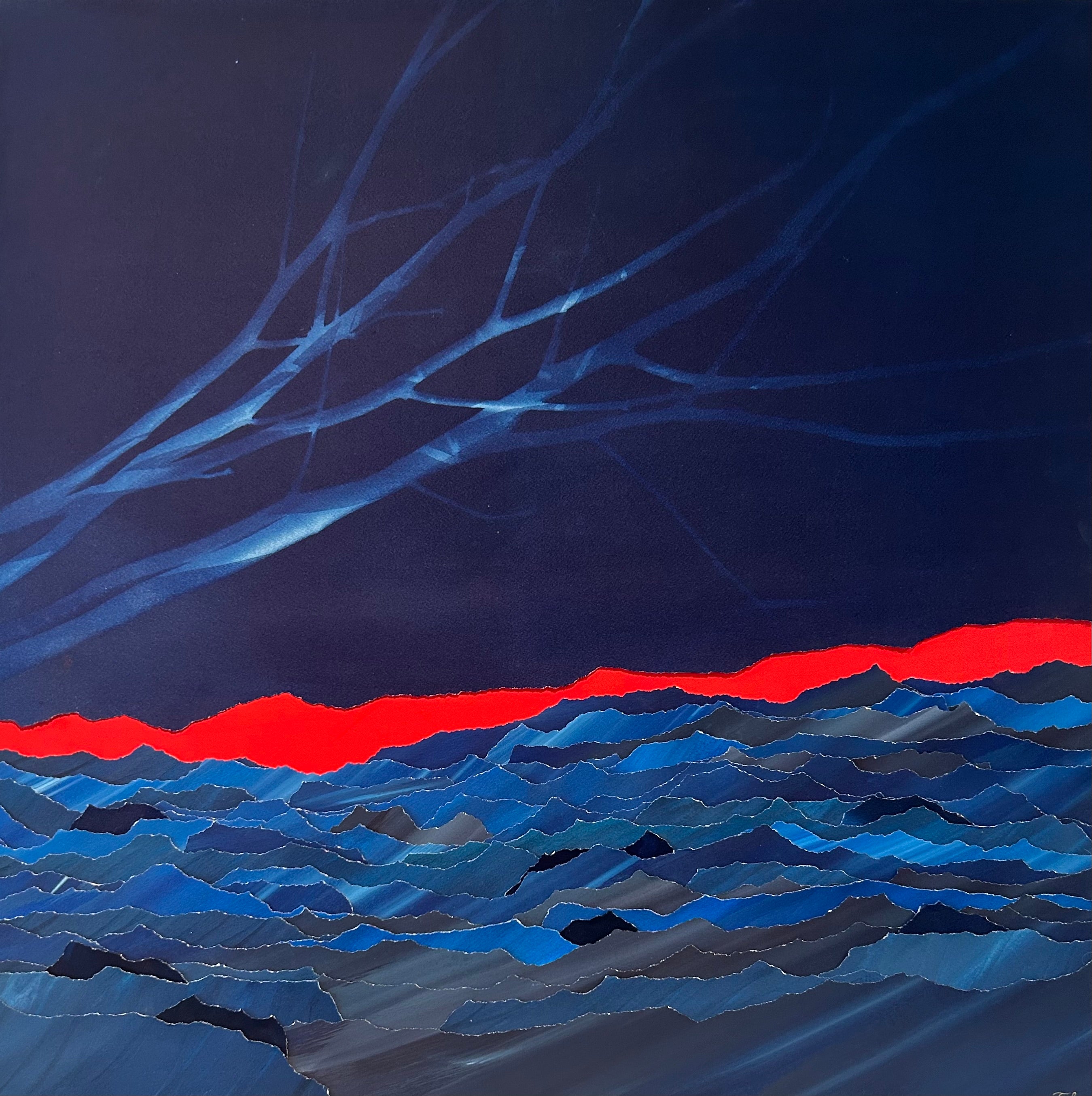 Des bleus profonds, des strates de papier, une ligne de lumière.